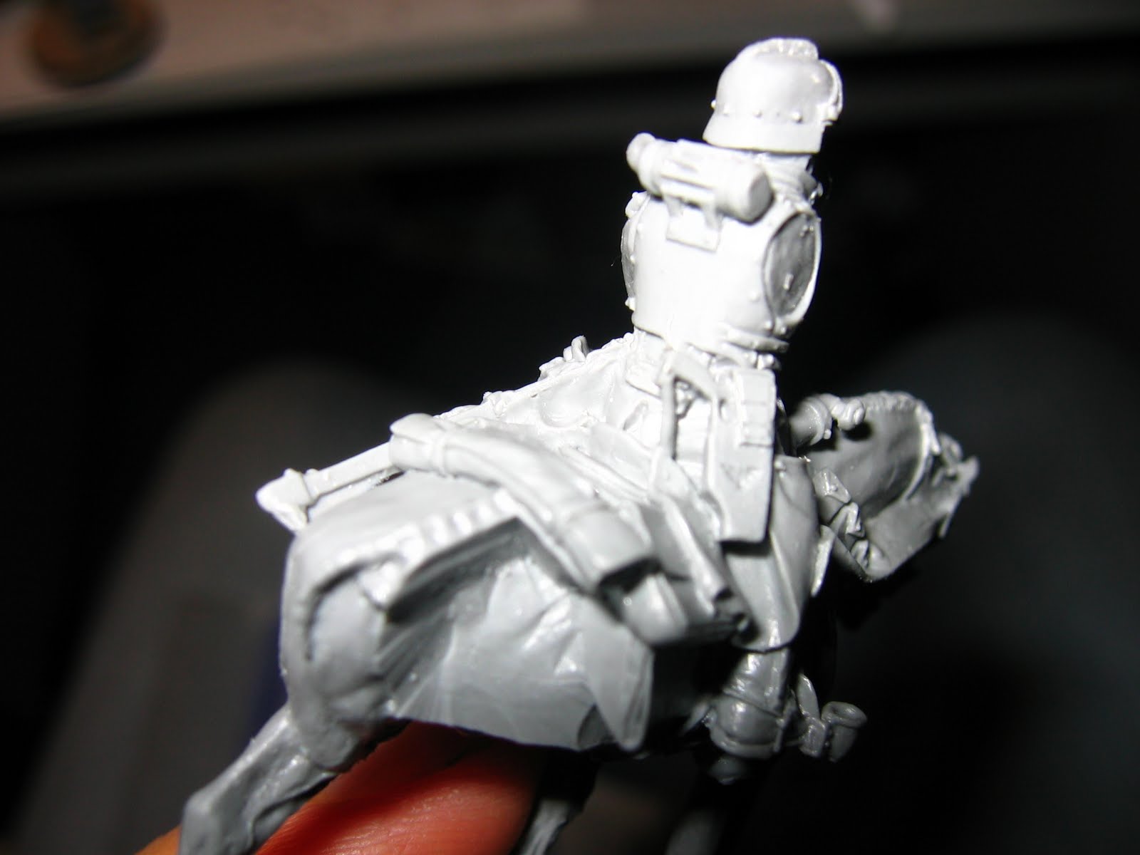 This picture shows some of the main moulding issues with these models, the canal joining the pistol handle to the saddle, this often required re-attaching the pistol handle as it snapped off, and carving the saddle/coat back into shape. This particular horse had issues with the reigns, whilst cutting them back into shape, i hacked a chunk off, and had to GS it back in - which was lovely...